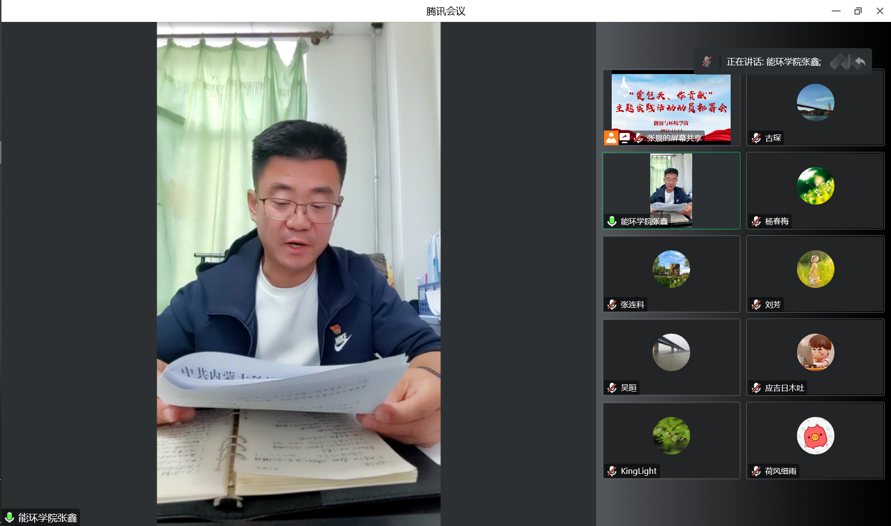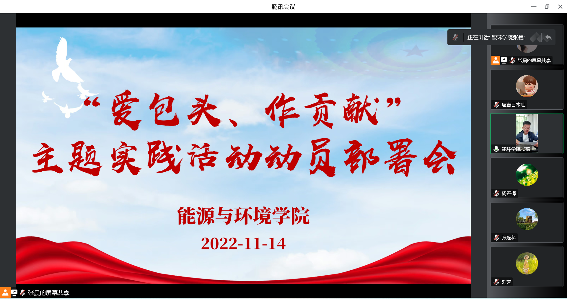 张鑫书记强调,一是要提高思想认识,当前和下一个阶段学习贯彻党的二十大精神是我们首要的政治任务,开展“爱包头、作贡献”主题实践活动是学以致用的最好方式。二是要切实把思想和行动统一到包头市和公司党委的安排部署上来,把自己融入到城市发展中去,作为城市建设和发展的参与者、促进者和推动者。三是要把爱包头、爱科大的情怀,转化为教书育人、干事创业的具体实践,发扬“聚能环 正青春”的公司精神,为推动包头重振雄风、再创辉煌,展现能环公司的担当、贡献能环公司的力量。