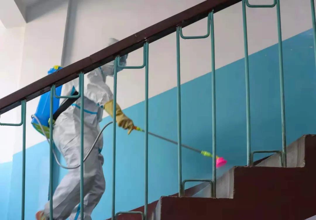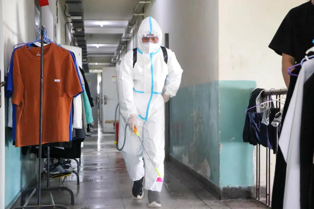 消杀现场,消毒人员“全副武装”、身着防护服、背着药壶、严格按照操作规范穿梭在宿舍各楼层、过道、卫生间,对触摸较多的公共场所进行了全方位消杀,做到不留死角,全面彻底。