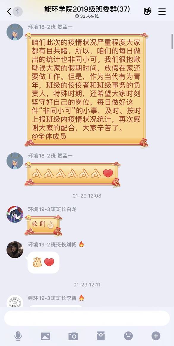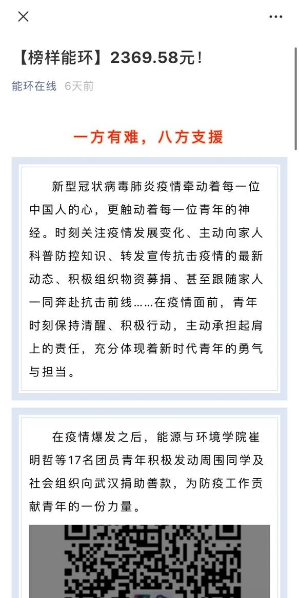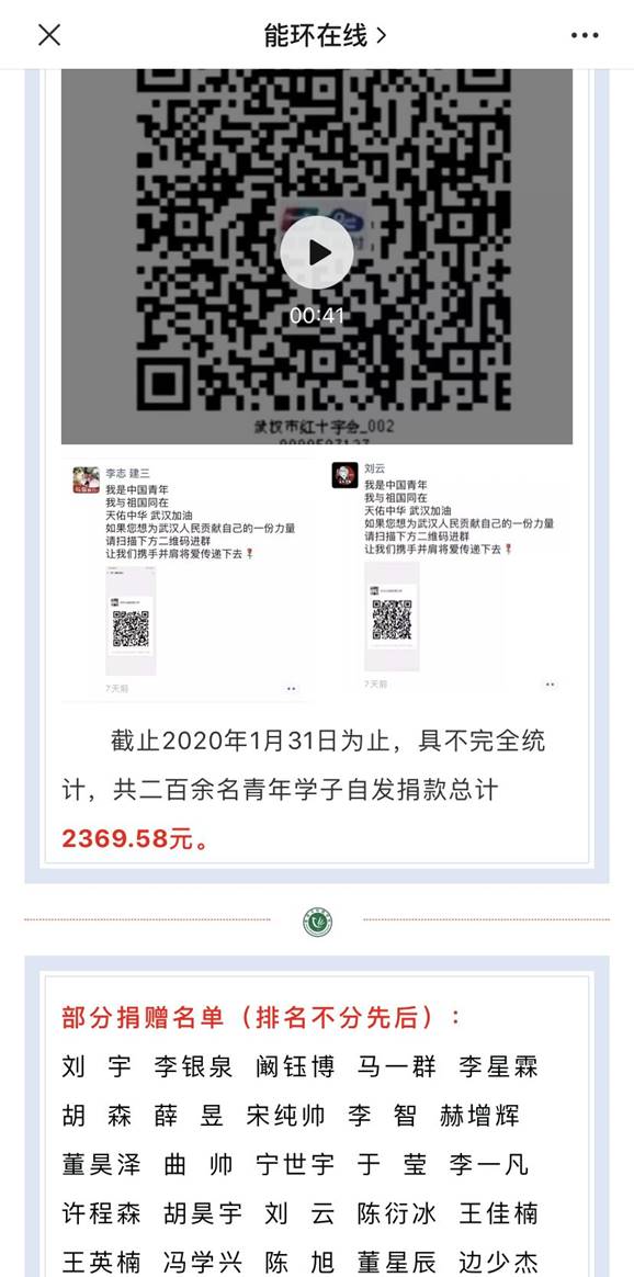“有一份热,发一份光。” 疫情暴发之后,在太阳集团tyc4633建环18-3班崔明哲等人的倡议下,公司二百余名团员青年向武汉捐助了二千多元善款,为防疫工作贡献青年的一份力量。他们给自己取名叫“中国青年”。