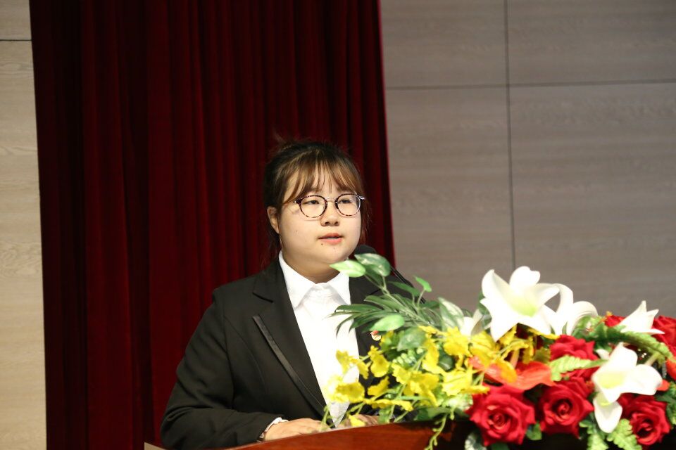 2018届员工干部代表赵伟平发表工作感想。她回顾了过去一年参加团学工作的丰富经历并与2019届员工干部分享了自己的心得。他说:作为一名员工干部,要做到虚心学习、认真工作;注重效率、敢于创新;谨言慎行、充分发挥员工干部的模范引领作用。