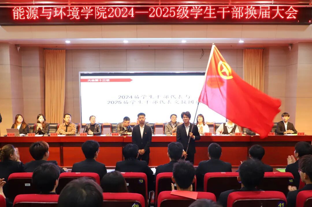 2024届员工干部代表张顺畅与2025届员工干部代表温泉交接团旗。